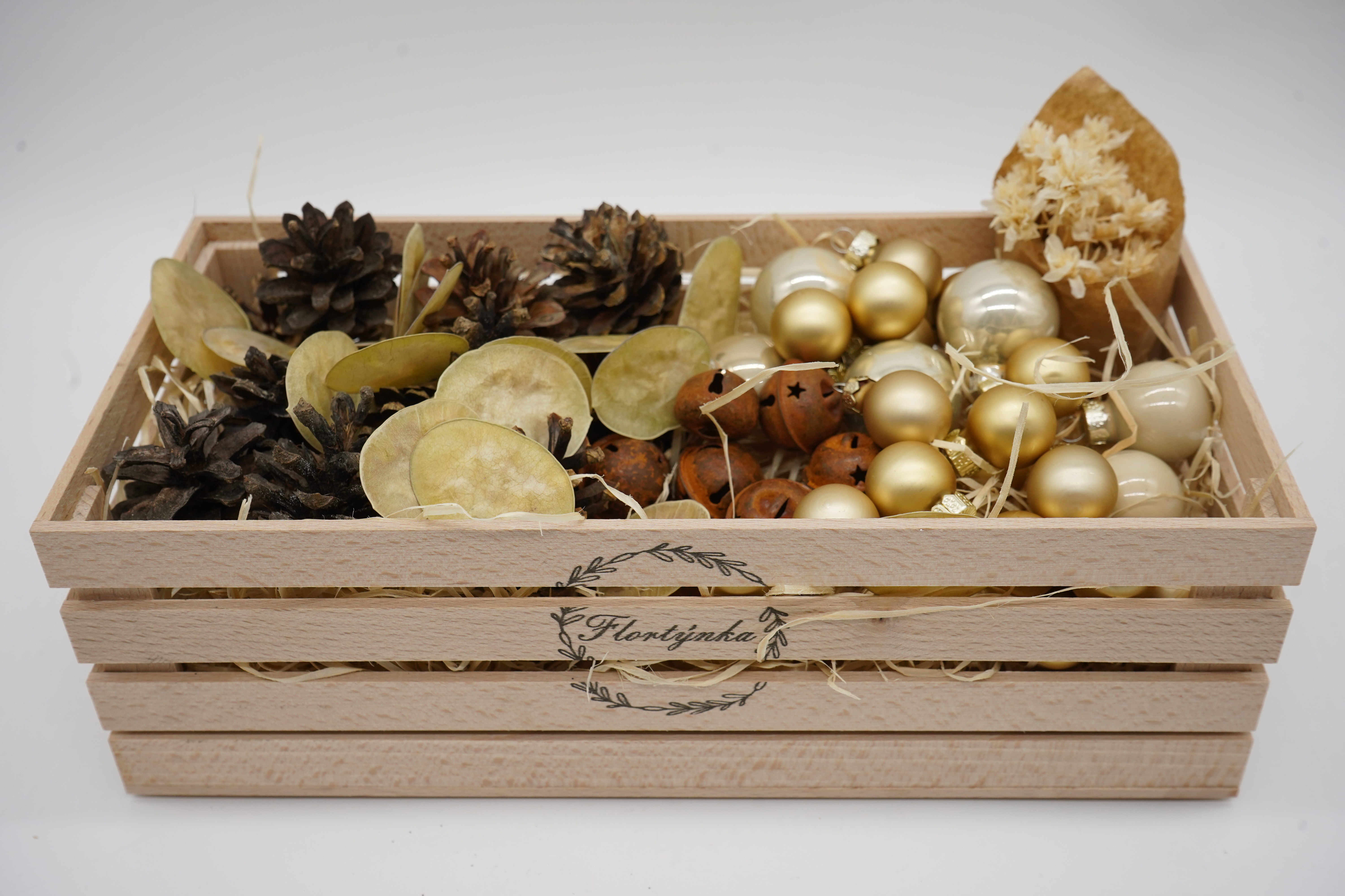Ručně vyrobená dřevěná bedýnka s komponenty pro tvorbu vlastního věnce. Obsahuje šišky, sušené květiny, skleněné koule a další dekorační prvky v elegantních přírodních tónech. Ideální dárek pro kreativní duše, které milují ruční tvorbu a originální dekorace.