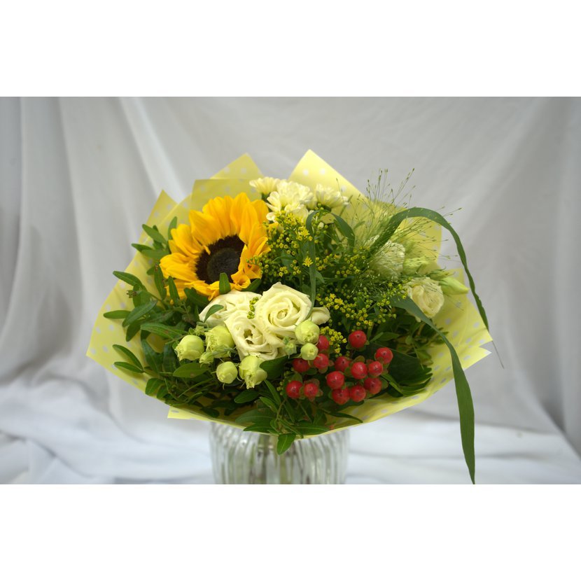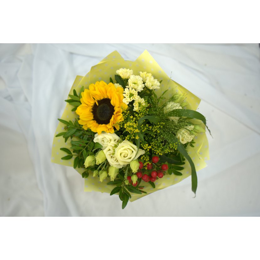 Slunečnice jako symbol radosti a optimismu září v této kytici jako malé slunce. V kombinaci s jemnými krémovými růžemi, bílými chryzantémami, drobnými bobulemi a luční zelení vytváří energickou a přitom vyváženou kompozici. Svěží zelené detaily a žlutý puntíkovaný papír kytici dodávají veselý nádech.