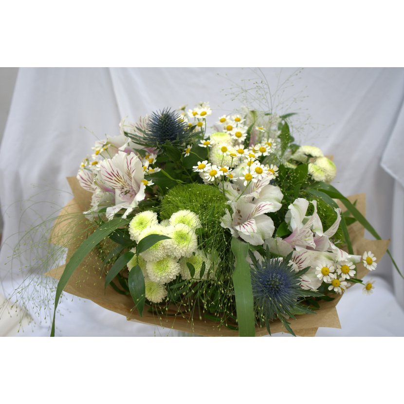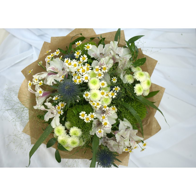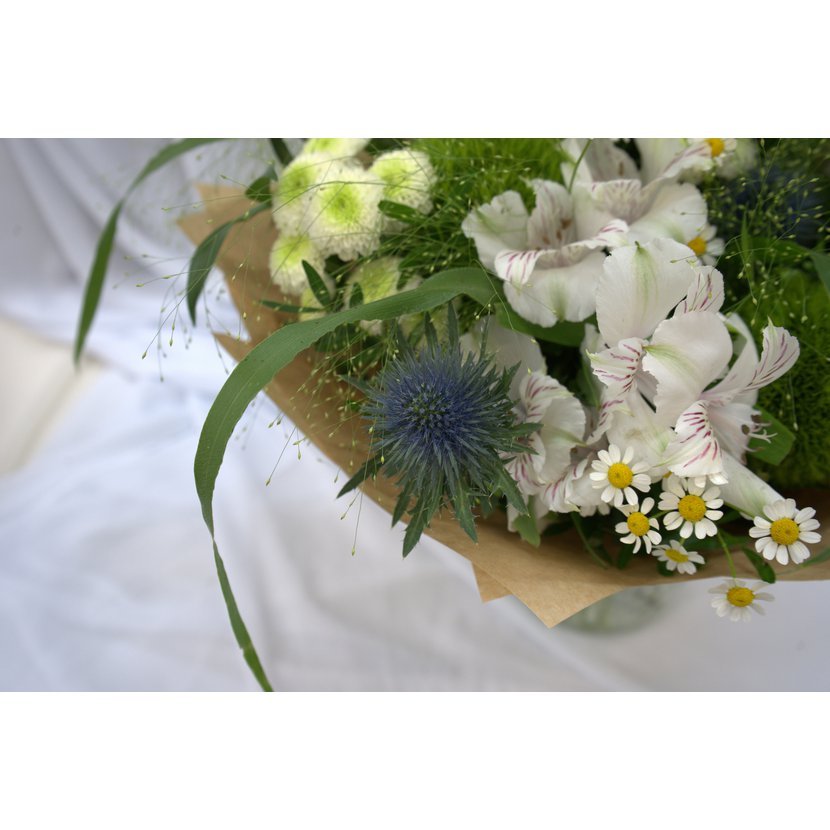 V srdci kytice se snoubí lehké tóny bílé s jasně zelenou a decentní modrošedou. Dominují elegantní bílé alstromérie s jemným žilkováním. Celek oživují neobvyklé modrošedé bodláky a nadýchané zelené chryzantémy či karafiáty, které dodávají kytici zajímavou texturu. Různorodá zeleň a jemné traviny propojují celé aranžmá a podtrhují jeho přirozený vzhled.