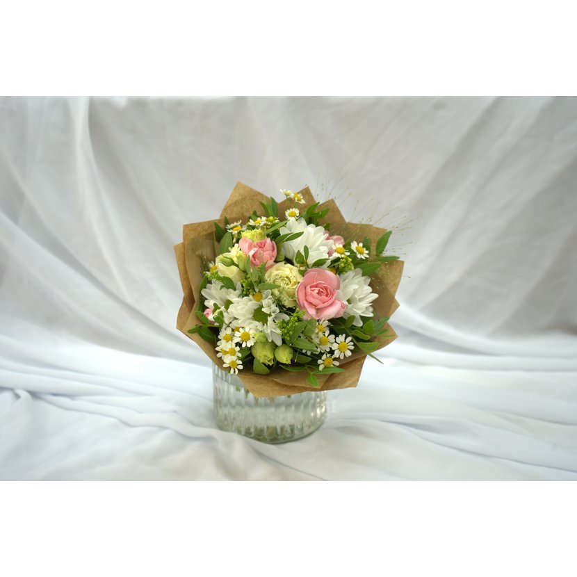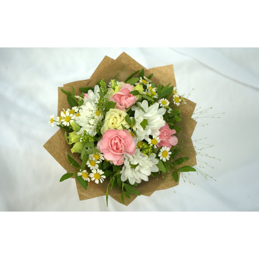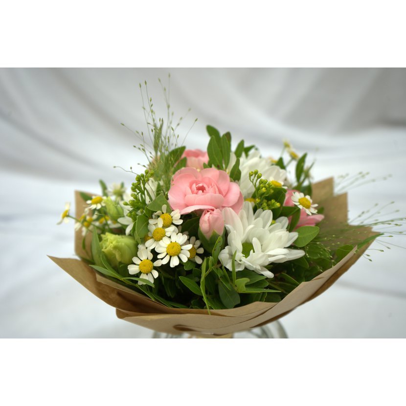 Tato něžná kytice spojuje romantické tóny růžových růží a svěží čistotu lučních kvítků. Jemné růže jsou doplněny bílými chryzantémami, voňavým heřmánkem a drobnými zelenými akcenty. Vše je ručně svázáno do přírodního balicího papíru, který podtrhuje její jemnost a lehkost.