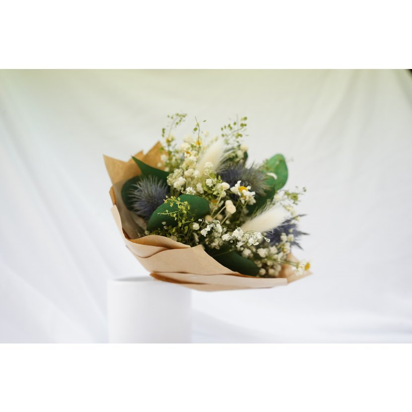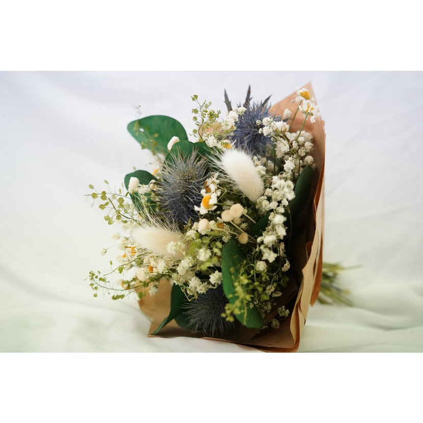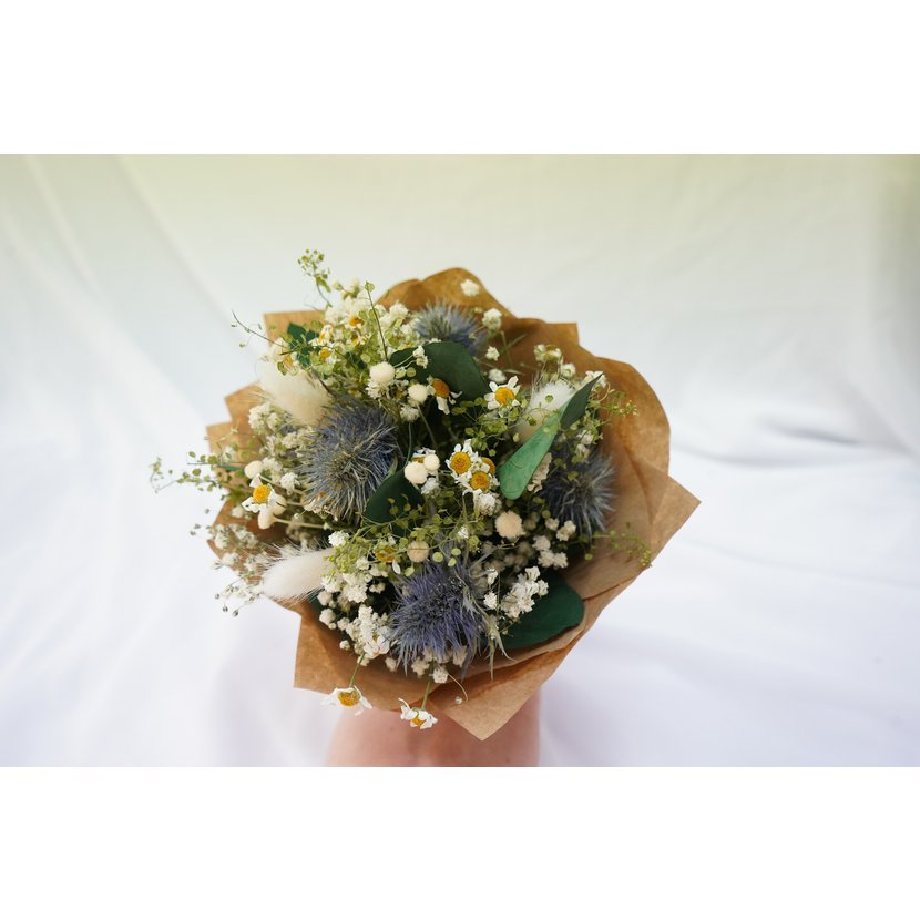 „Divoké pole“ je jemná dekorace v podobě ručně vázané sušené kytice, která v sobě spojuje přírodní krásu lučních kvítků a travin. Kombinace modrých bodláků, heřmánkových kvítků, bílých detailů a zelených lístků vytváří svěží, autentický dojem připomínající procházku volnou přírodou.