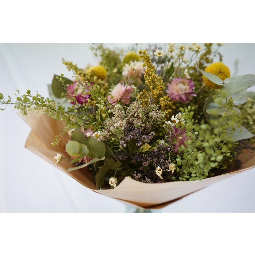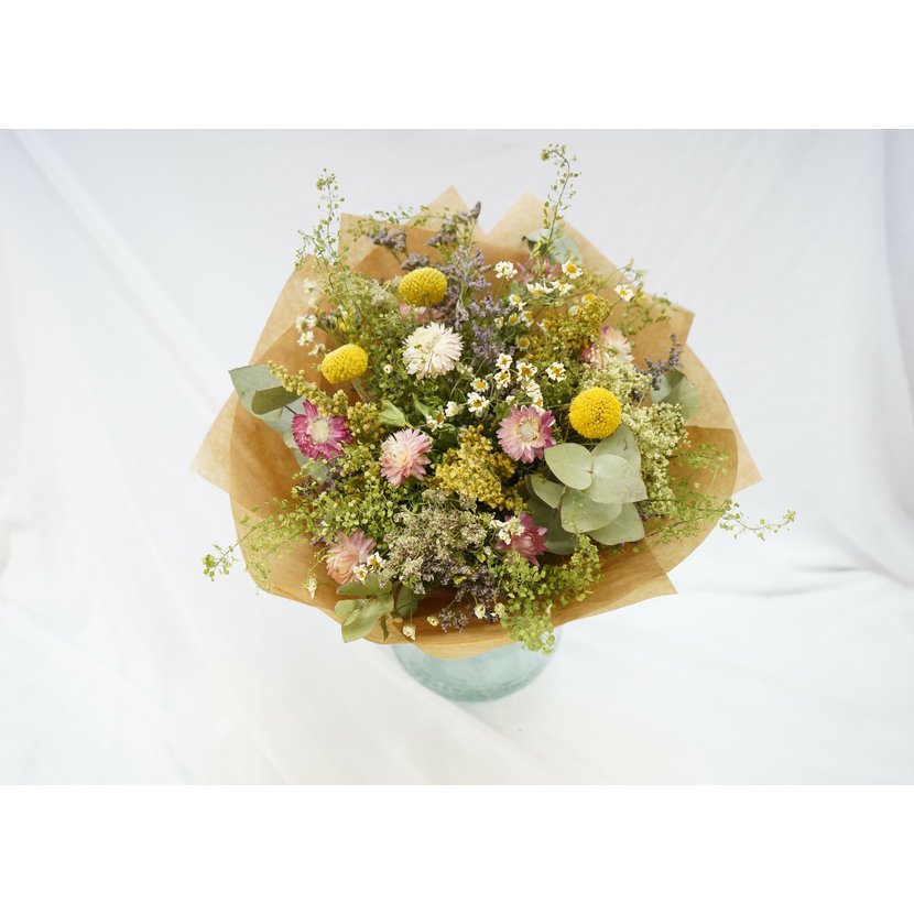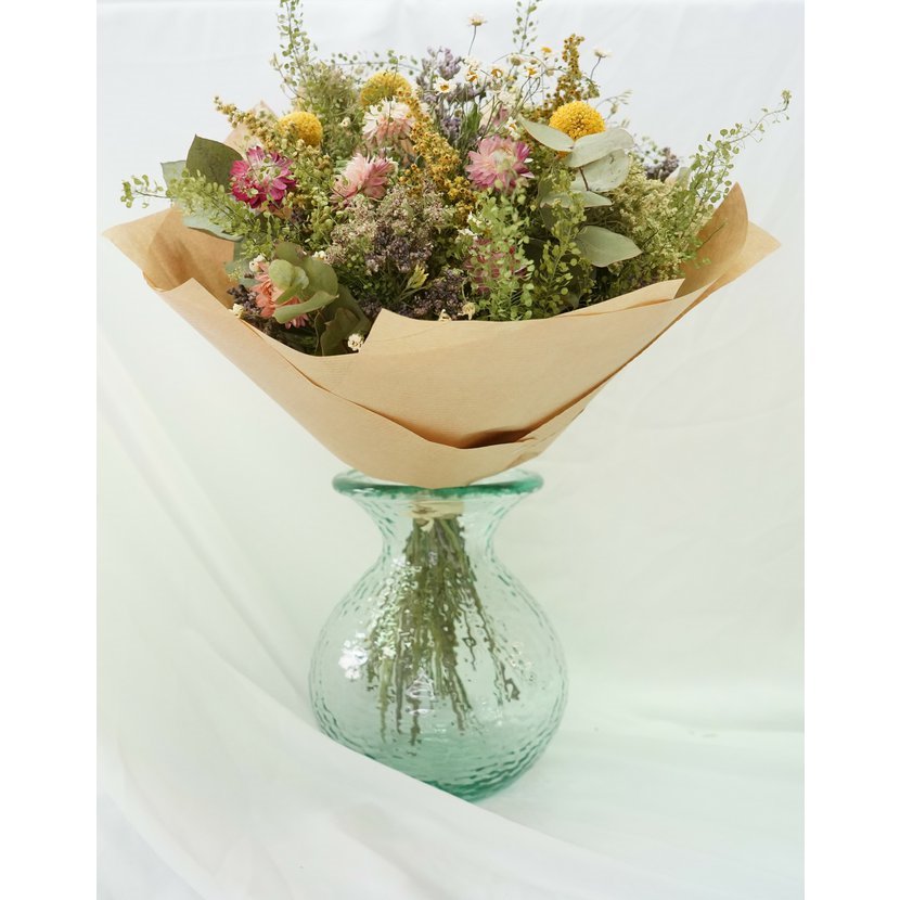 Kytice je vázána do přírodního papíru, takže ji stačí jen postavit do vázy nebo darovat. Díky sušeným materiálům potěší svým vzhledem dlouhé týdny až měsíce bez nutnosti péče.
