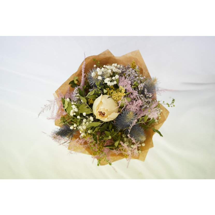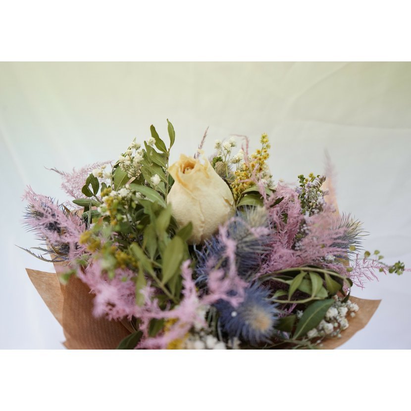 Kytice hraje půvabnými odstíny růžové a fialové, které se prolínají s čistou bělostí a jsou podtrženy svěží zelení. Její bohatý a plný tvar, plný různě velkých a strukturovaných květů, vytváří dojem luxusu a harmonie. Každý pohled na ni navozuje pocit klidu a krásy, jako stvořený pro ty nejjemnější okamžiky.