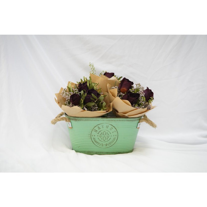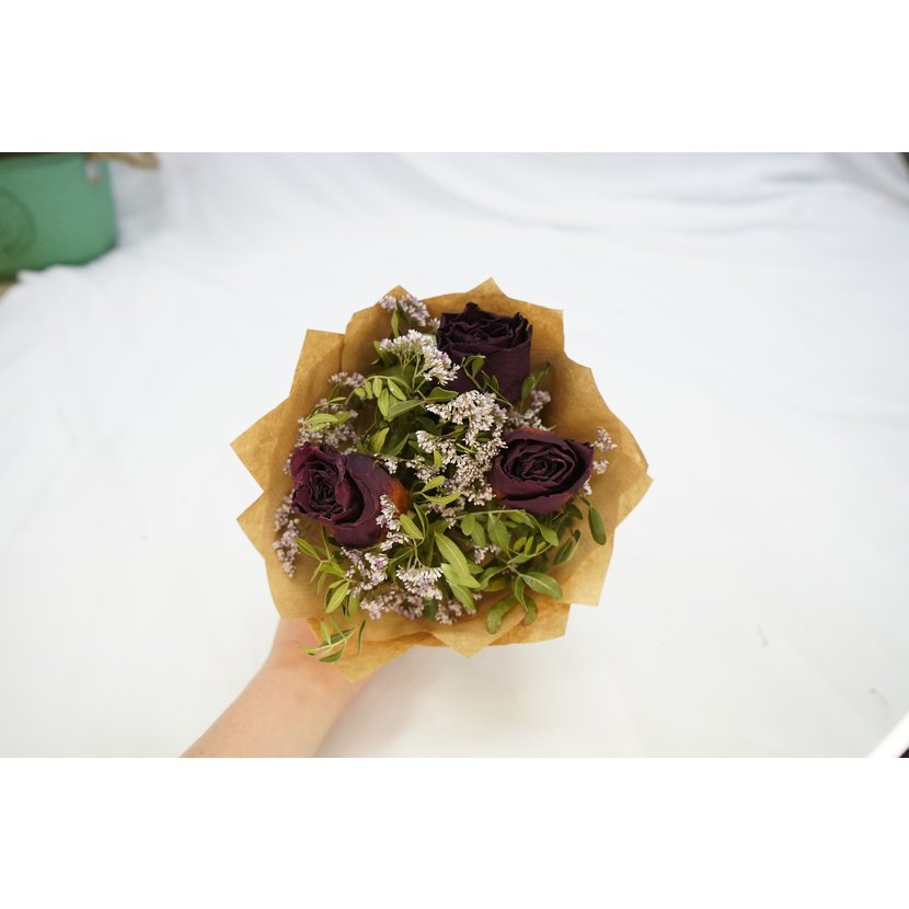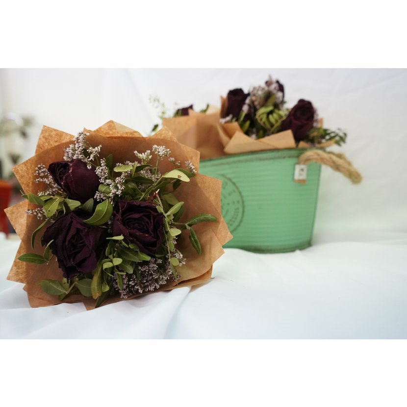 Kytice je dominantně tvořena sytými, sametově rudými květy, které jsou obklopeny jemnou zelení a drobnými, světlejšími akcenty. Její kompaktní a bohatý vzhled, s důrazem na plnost hlavních květů, vytváří dojem luxusu a silného poselství. Každý pohled na ni navozuje pocit hluboké romantiky a nezapomenutelné chvíle.