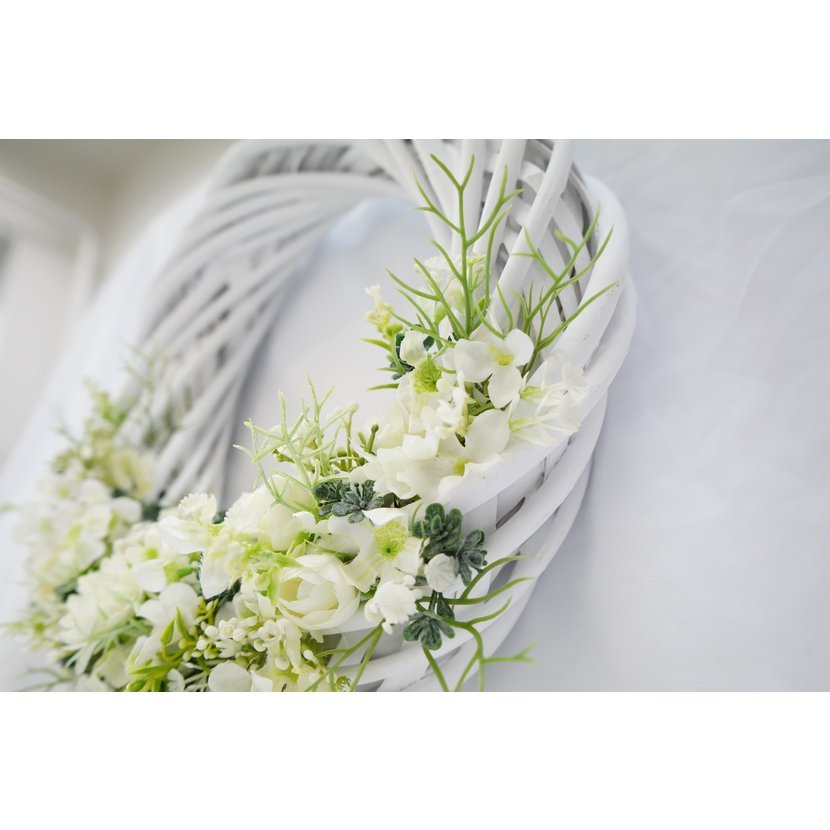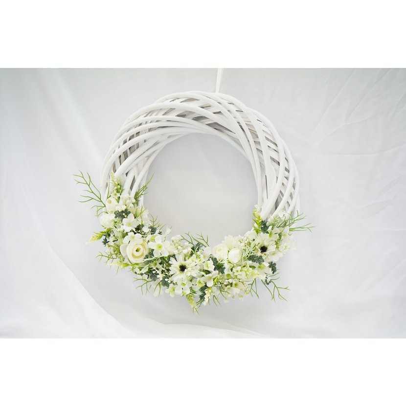 Elegantní dekorační věnec v jemném bílém provedení je ideální volbou pro každého, kdo hledá vkusnou a univerzální dekoraci. Základem věnce je pevná, bíle natřená proutěná konstrukce, zdobená detailně propracovanými umělými květy v bílých tónech, doplněná svěží zelení.
