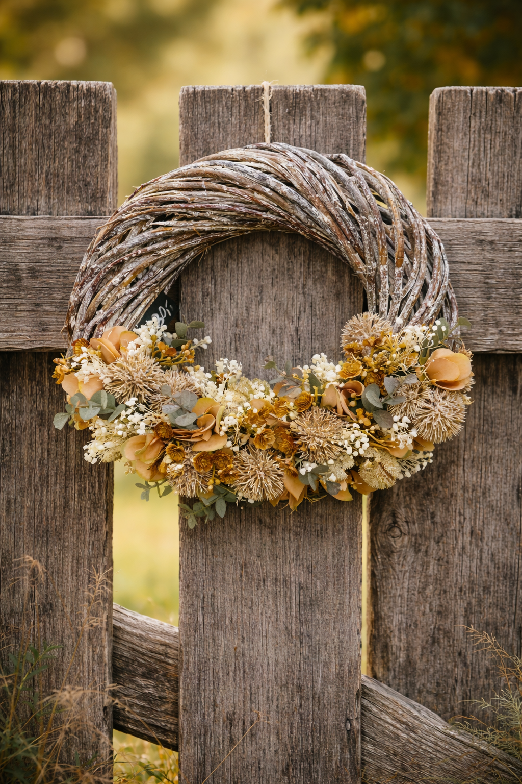 Vneste do svého domova klidnou atmosféru teplých tónů a přírodní elegance s věncem „Podzimní pohlazení“. Tento ručně aranžovaný věnec z přírodního proutí s jemnou patinou je laděn do béžovo-karamelových odstínů a doplněn sušenými i umělými květy, které evokují kouzlo pozdního léta a podzimu.